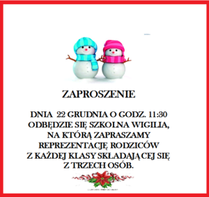 ZAPRASZAMY NA SZKOLNĄ WIGILIĘ 05/02/2018 by SSP nr 1 2017.12.19 Zapraszamy na szkolną Wigilię. Nawigacja wpisu Previous Post DRODZY RODZICE I UCZNIOWIE!!!!Next Post TERMINARZ SPOTKAŃ W RAMACH DRZWI OTWARTYCH – ZAPRASZAMY